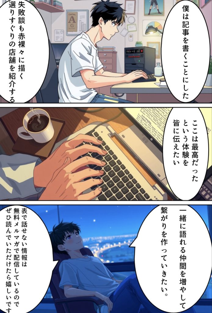 2024.10.07 2024.10.09 物語ゆうじ マンガで自己紹介〜なぜチャイエスブログを始めたのか〜 ポスト シェア はてブ 送る Pocket こんにちは。ゆうじです。 今日は僕がチャイエスブログを書き始めるまでの物語をマンガにしてみました。 【僕が書いている無料メルマガはこちら】 無料で登録できて、すぐに解除も可能です。 登録後、上記のプレゼントをお送りします。 お楽しみに。 https://my902p.com/p/r/q1ER97l1